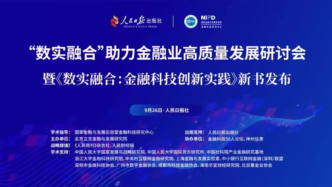 导读:9月26日,在国家金融与发展实验室金融科技研究中心学术指导,人民日报出版社出版支持下,由北京立言金融与发展研究院主办,金融科技50人论坛、神州信息协办,中国人民大学国家发展与战略研究院等学术机构、协会支持的“‘数实融合’助力金融业高质量发展研讨会暨《数实融合:金融科技创新实践》新书发布”在北京人民日报社图书馆成功举办。来自金融科技领域的多位重磅专家及入围案例的代表机构进行了精彩分享。